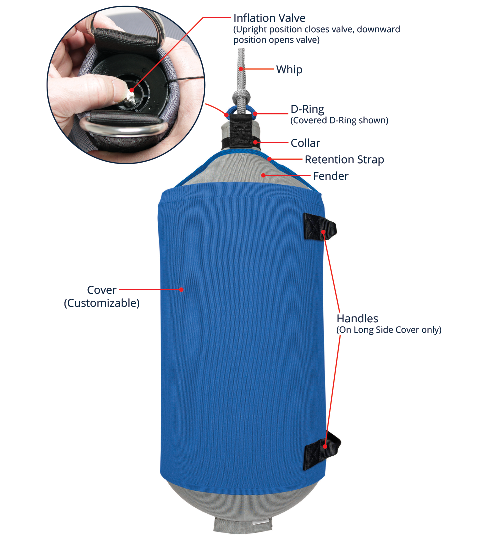 For extreme weather or rough docking conditions, the fender bladder can be filled with clean water to add temporary weight. Water can be easily drained when not needed.